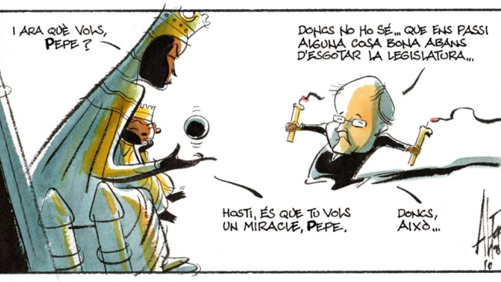 -¿Y ahora qué quieres, Pepe? -Pues no sé... que nos pase algo bueno antes de acabar la legislatura. -Jolín, es que tu quieres un milagro, Pepe. -Pues eso...