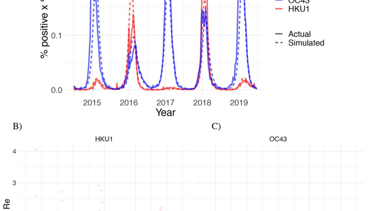 El color azul corresponde al virus "HCov-OC43" y el color rojo al virus "HCoV-HKU1".