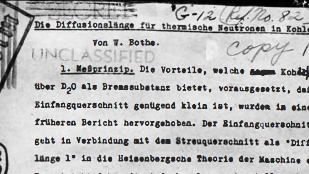 –Walther Bothe, "La Longitud de difusión de los neutrones térmicos en el carbono". Fechado el 5 de junio de 1940, Kernphysikalische Forschungsberichte (G-12).