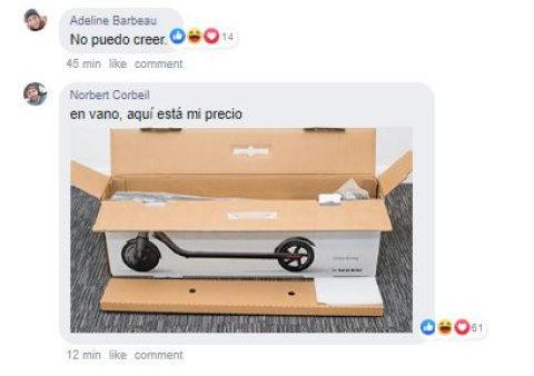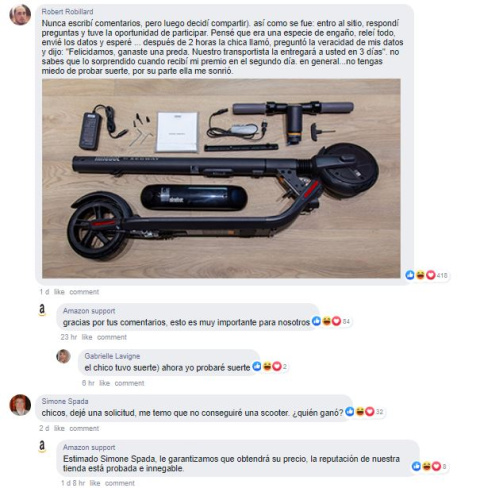 La primera pregunta de esta encuesta que se marcan como parte del desarrollo del timo, "¿Eres de España?", no se sabe si descarta de participar en la oferta fraudulenta a los extranjeros residentes en nuestro país. Menos mal que luego matizan que es "sólo para los residentes en España". Lo curioso es que este bulo cuenta con el falso aliento de docenas de personajes que comentan lo rápido que les ha llegado el patinete y cuánto mola, y entre ellos no hay ni un solo nombre o apellidos españoles, lo cual es también bastante esclarecedor.