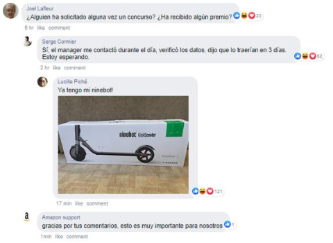 Como vemos, Amazon ha desaparecido y nada es lo que parecía: de un patinete casi de regalo hemos pasado a una encuesta y de una encuesta a un sorteo que además conlleva una suscripción y un coste de 33 euros cada 14 días. Un nuevo timo sacacuartos en toda regla que se difunde al amparo de Facebook, una vez más.