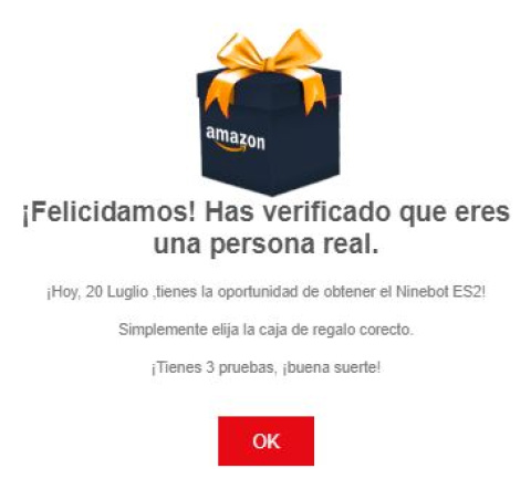 "¡Hoy, 20 Luglio ,tienes la oportunidad de obtener el Ninebot ES2! Simplemente elija la caja de regalo corecto. ¡Tienes 3 pruebas, ¡buena suerte!".