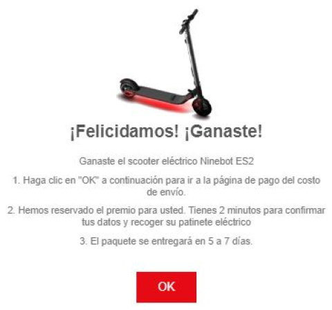 "¡Felicidamos! ¡Ganaste! Ganaste el scooter eléctrico Ninebot ES2