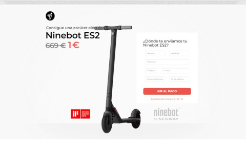 El caso es que te vuelven a 'felicidar' para confirmarte que "ganaste el scooter eléctrico Ninebot ES2", esta vez 'a mitad de precio': "1 euro". Te mandan a una presunta "página de pago del costo del envío" y te meten más prisa -"tienes 2 minutos"- para que te pongas más nervioso y no te fijes mucho en cómo te timan.
