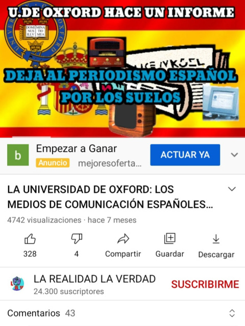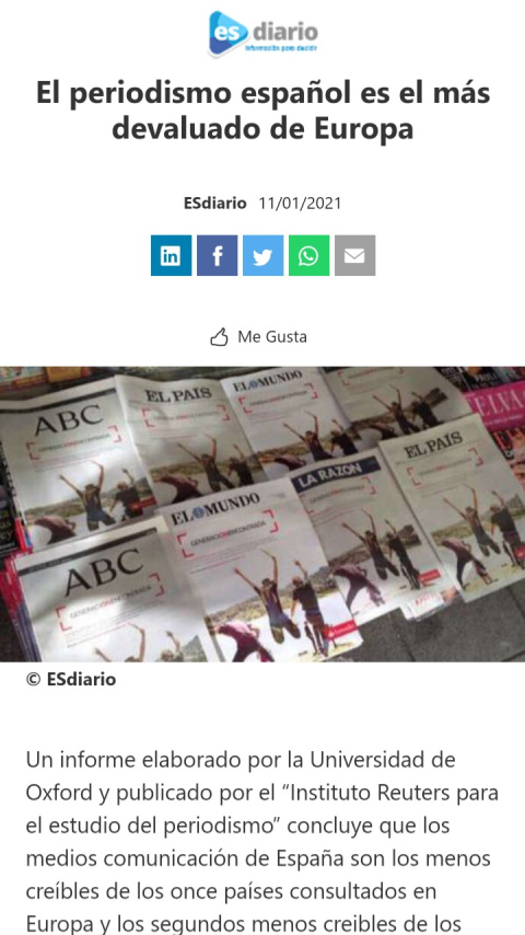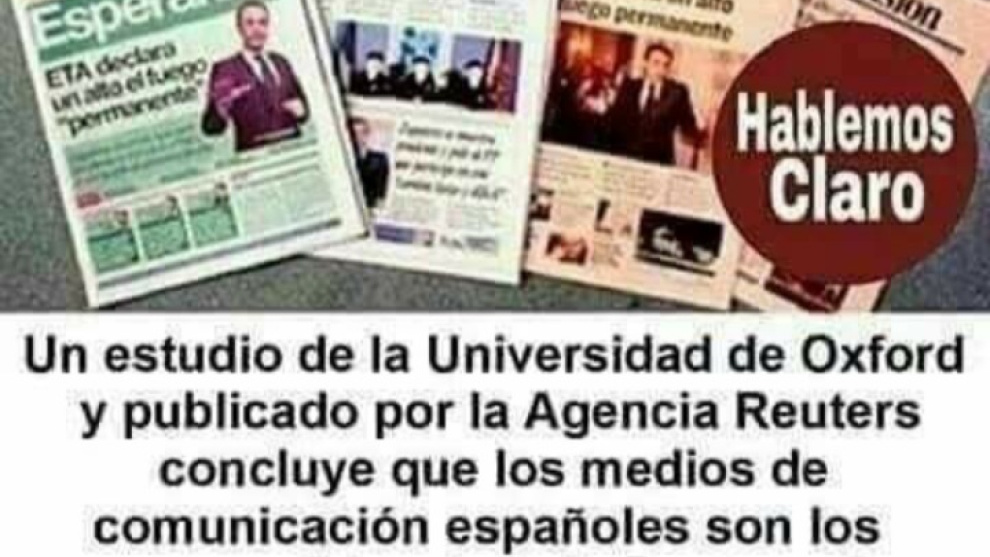 "¡Aquí ya se sabía! Hablemos claro. Un estudio de la Universidad de Oxford y publicado por la agencia Reuters concluye que los medios de comunicación españoles son los menos creíbles de toda Europa y los segundos más mentirosos de todo el mundo, sólo superados por los medios de comunicación de los Estados Unidos".