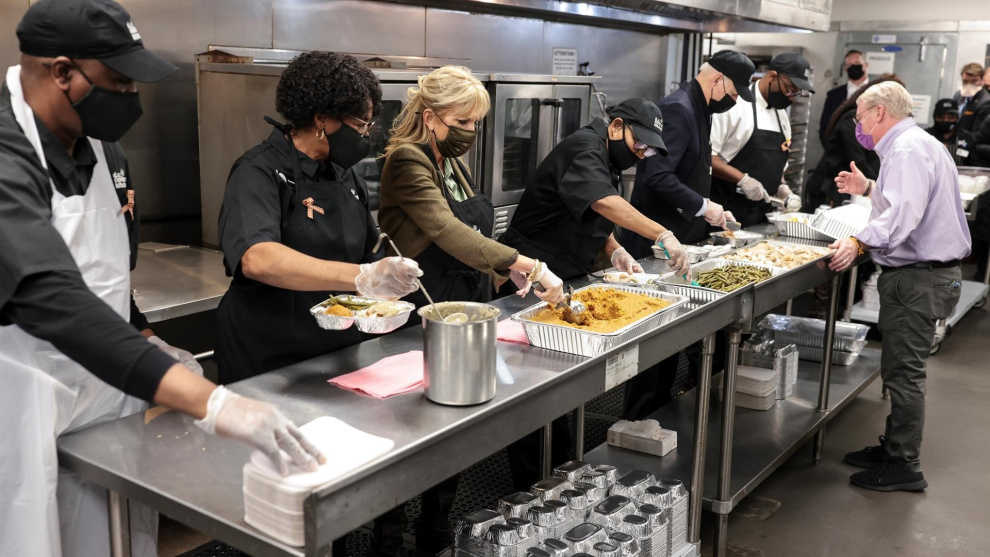 Joe Biden i Jill Biden preparen safates d'aliments a Washington, a la seu d'una organització benèfica -- Oliver Contreras / EFE