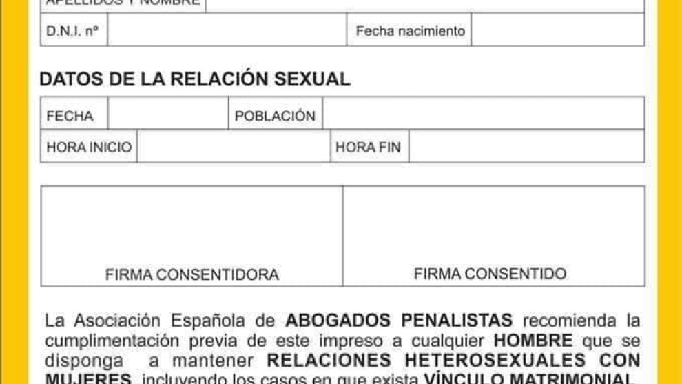 "La Asociación Española de ABOGADOS PENALISTAS recomienda la cumplimentación previa de este impreso a cualquier HOMBRE que se disponga a mantener RELACIONES HETEROSEXUALES CON MUJERES, incluyendo los casos en que exista VÍNCULO MATRIMONIAL, sea éste de naturaleza civil o religiosa".