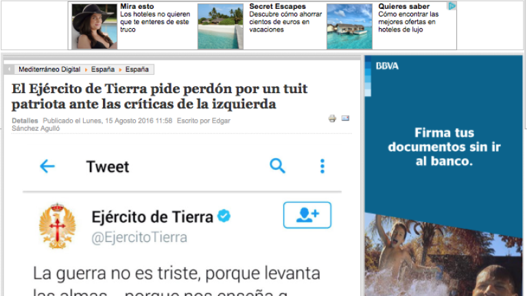 La guerra no es triste, porque levanta las almas... porque nos enseña q fuera d la Bandera, nada, ni aún la vida, importa. Gracias Rafa (sic). Así tuvo la ocurrencia de felicitar a Rafa Nadal el Ejército de Tierra en Twitter. Serán muchos los que, para intentar justificar lo acontecido, afirmen que la felicitación es obra de un botarate, un memo de esos que se encuentran en cualquier lugar. Haríamos mal en creer que este es un ejemplar aislado.