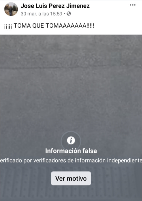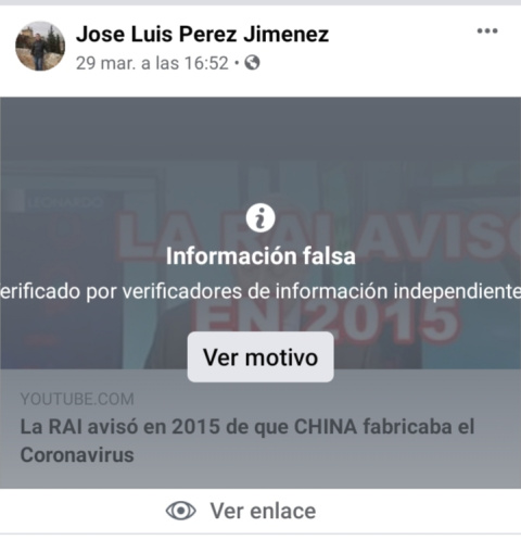 Entre los contenidos que este hombre que "vive en Algeciras" ha lanzado y han sido rotulados por FB advirtiendo de su falsedad, podemos encontrar el ya trillado vídeo del supuesto transportista que desplazaba papel pero decía que eran mascarillas españolas para Francia, otro que cita que "la RAI avisó en 2015 de que China fabricaba el coronavirus" o las necedades de un colega gurú de la patraña online que se hace llamar Spiriman, ya ampliamente desmontado.