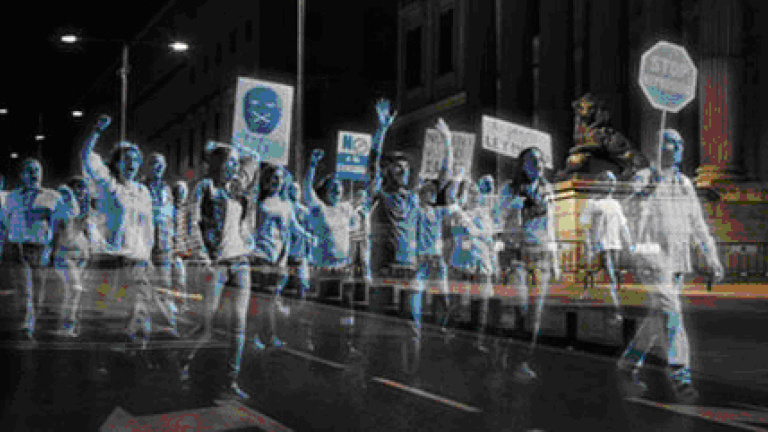Creo que no hay imagen que mejor resuma todo esto que la manifestación en forma de hologramas, celebrada frente al Congreso español por la organización No Somos Delito. Como decía el New York Times, “por el momento las protestas en forma de hologramas no son ilegales en España; aunque increíblemente casi todas las demás protestas pacíficas lo serán a partir del 1 de julio”. “Fue la primera de la historia y confiemos en que sea la última”, dijeron los organizadores.
