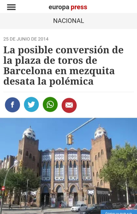 "Las negociaciones para levantar una mezquita en la mítica plaza Monumental de Barcelona están muy avanzadas. El grupo Balañá, dueño de la plaza, ha dado el sí quiero al emir de Qatar, Tamim bin Hamad al Zani, que ha ofrecido 2.200 millones para construir allí un centro de culto islámico, según cuenta Mowafak Kanfach, fundador de la Casa del Libro árabe en Barcelona, e impulsor del proyecto. Kanfach lleva casi dos décadas luchando para que Barcelona tenga una mezquita".