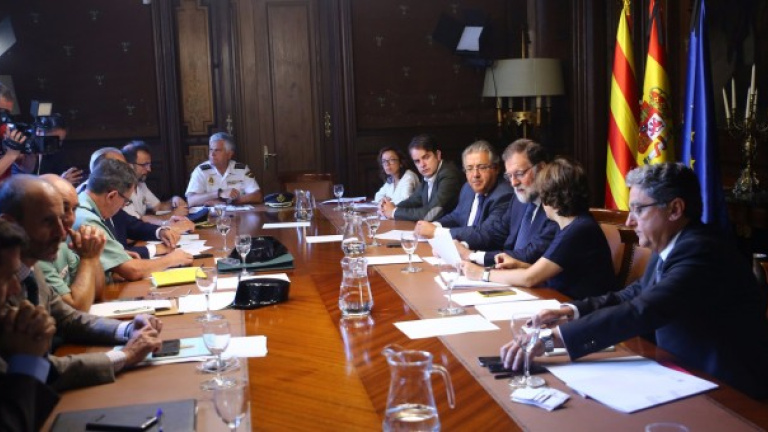 En dos ocasiones ha salido ya el ministro del Interior, Juan Ignacio Zoido, a lanzar brindis al sol de la "unidad" y la "absoluta cooperación" en la lucha antiterrorista, sólo días después de que sus propios actos lo desmintiesen: nada más confirmarse que la masacre de las Ramblas se debía a un atentado terrorista, la cúpula del Ejecutivo –con Mariano Rajoy y Soraya Sáenz de Santamaría a la cabeza– se trasladó a Barcelona... pero no para integrarse en el gabinete de emergencia creado allí por la Generalitat, sino para formar su propio gabinete de crisis y atribuirse así el mando político de las operaciones policiales contra el comando asesino. Tan clara era esa intención, que ni esa noche ni a la mañana siguiente se invitó a esas reuniones a representante ninguno de la Generalitat, ni siquiera de los Mossos d'Esquadra que estaban persiguiendo sobre el terreno a los yihadistas. Como se puede apreciar en esta imagen de la segunda reunión: