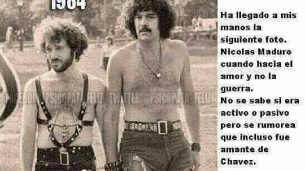 Es ya como un Sandro Rey caribeño. Mira que lo pone a huevo, además, pero se ve que los detractores de este hombre no encuentran suficientes argumentos para desacreditarle en las tonterías que dice y en su nefasta gestión, porque además están compartiendo ahora en masa una imagen en la que sale un presunto Nicolás Maduro joven, en 1984, de la mano de otro hombre, documento que probaría que el líder bolivariano era y es gay. El 23 de noviembre de 2018 cumplió 58 años, así que por entonces tendría solo 22.