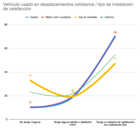 Si cruzamos los datos de “vehículo usado en desplazamientos cotidianos” con “tipo de instalación de calefacción”, se ve que los usuarios de la bicicleta tienen el sistema de confort doméstico más endeble, pues un 33% declaran no tener ninguno, tres veces más que los usuarios del coche o el transporte público. El 23% de los caminantes dicen lo mismo. Usar la bicicleta o caminar y carecer de un sistema fijo de calefacción indica una huella ecológica muy baja. La pauta de sistema de calefacción de los usuarios de transporte público se superpone estrechamente con la de los usuarios del coche. Los caminantes quedan casi justo en medio de los dos extremos.