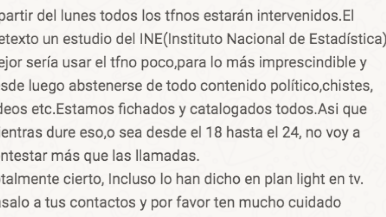 Eso ya es falso, pero la nota cita después que "lo mejor sería usar el tfno poco, para lo más imprescindible, y luego abstenerse de todo contenido político, chistes, vídeos, etc", porque "estamos fichados y catalogados todos".