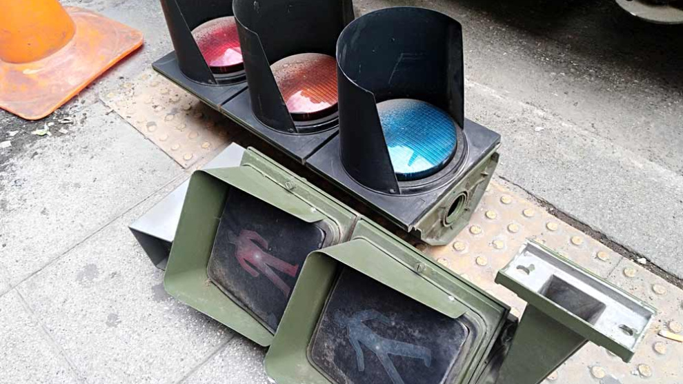 Semáforos desmontados en la Puerta del Sol, ahora inútiles.