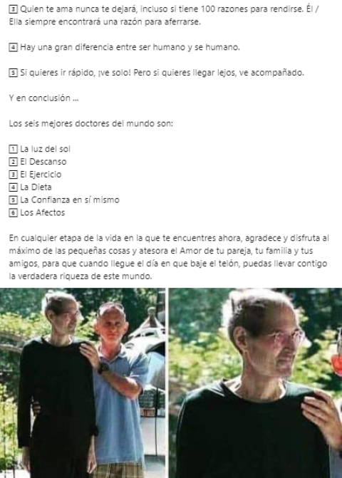 El texto, al que le faltan tildes y del que no se aclara si lo pronunció Jobs o lo escribió, continúa con "cinco hechos innegables" y una "conclusión", y termina con una frase que sorprendería si la hubiese aportado el fundador de Apple, pero no es así: