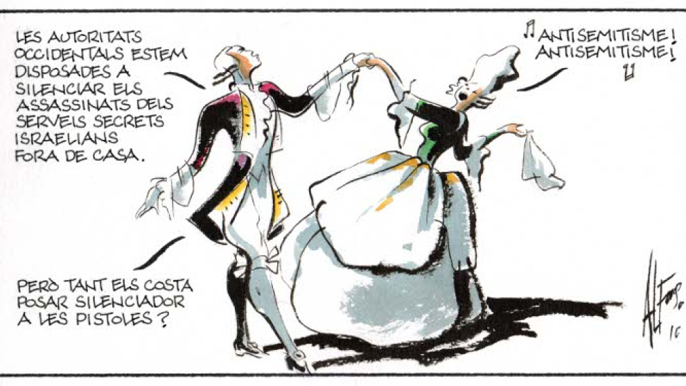 -Las autoridades europeas estamos dispuestas a silenciar los asesinatos de los servicios secretos israelianos fuera de casa. -¡Antisemitismo! ¡Antisemitismo!- -¿Pero tanto les cuesta ponerles silenciador a las pistolas?