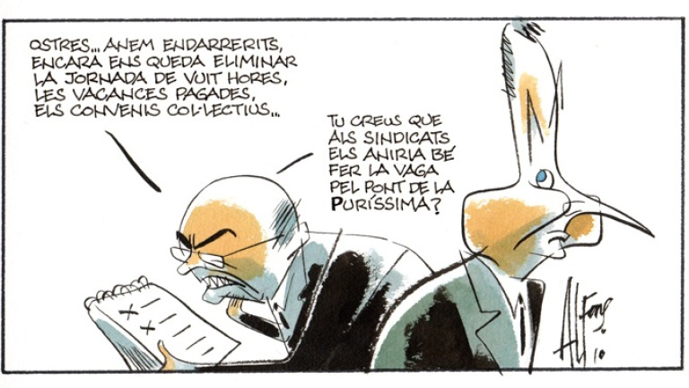 -Caray, vamos retrasados. Aún nos falta eliminar la jornada de ocho horas, las vacaciones pagadas, los convenios colectivos... »¿Crees que a los sindicatos les vendría bien ir a la huelga para el Puente de la Purísima?