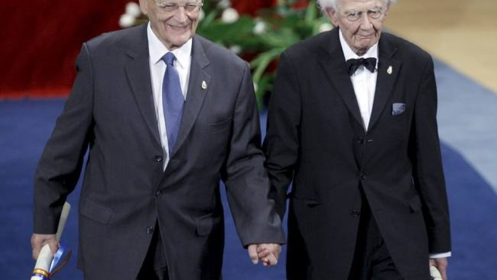 Con permiso de la ONG de confesión católica Manos Unidas, que recogió el premio a la Concordia, a mí las manos que me emocionaron en la entrega de los últimos Premios Príncipe de Asturias fueron las de los sociólogos Zygmunt Bauman y Alain Touraine, que compartieron el de Comunicación y Humanidades. En la ceremonia, los dos colegas (ambos nacieron en 1925) después de recoger sus “diplomas”, y antes de comenzar el paseíllo hacia el público, se tantean en un momento de incertidumbre, como buscándose uno a otro, hasta que al fin se agarran de la mano y echan a andar.