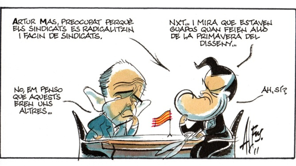 Artur Mas, preocupado porque los sindicatos se radicalicen. -Ay, y mira que estaban guapos cuando hacían aquello de la primavera del diseño... -No, creo que esos eran otros... -¿Ah, sí?