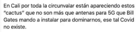 Existe, por ejemplo, un vídeo de un hombre que graba lo que supuestamente son antenas 5G en la Autopista Suroriental de Cali, Colombia. Afirma que esas antenas son "la razon por la cual nos tienen en cuarentena" y que el confinamiento ha sido un pretexto para instalar en el sur de la ciudad "pura tecnología 5G". Ese es "el motivo por el cual nos inventaron el Covid-19", añade. Pero en Cali no hay antenas 5G, y menos con forma de cactus.