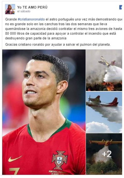 Mientras que del delantero luso de la Juve se afirma que es "Grande Cristiano Ronaldo. El astro portugués una vez más demostrando que no es grande solo en las canchas. Tras las dos semanas que lleva quemándose la Amazonía, decidió contratar él mismo tres aviones de hasta 80 000 litros de capacidad".