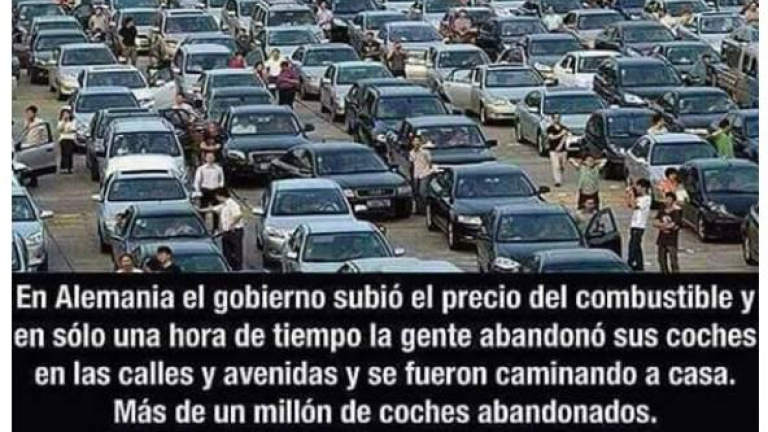 Seguramente por eso podemos encontrar en Internet, ahora y desde hace casi un año, algunas páginas en distintos idiomas que aseguran que "en Alemania el gobierno ha subido el precio del combustible" e inmediatamente, "en solo una hora", más de un millón de coches han sido abandonados por sus dueños para colapsar las calles en señal de protesta, provocando con ello la bajada instantánea de los precios.