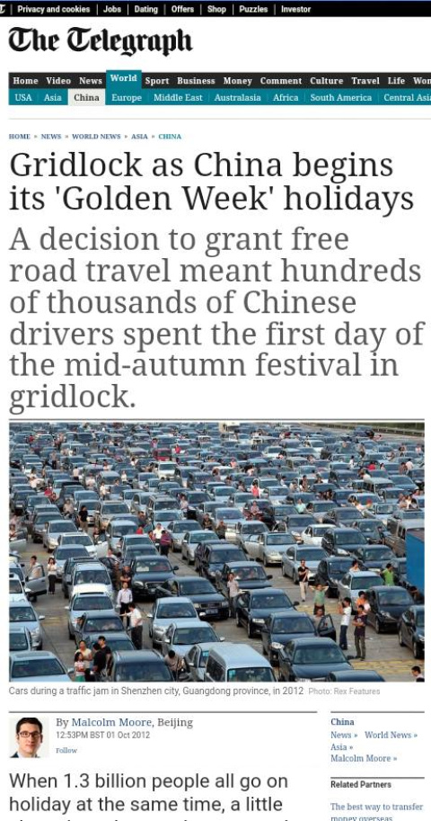 Y lo consiguió, pero con unos resultados nefastos, ya que el primer día de la semana festiva miles de coches permanecieron parados durante horas en las carreteras debido a multitud de colapsos de tráfico en torno a ciudades de toda China. Y eso que el otro objetivo de no cobrar los peajes era precisamente evitar los atascos.