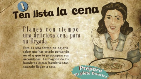 Esta guía con los once mandamientos de la buena esposa comenzaba por el estómago: "Ten lista la cena". La idea era que cuando éste llegara a casa, en el momento que él quisiera, su mujer le hubiera preparado una rica comida y así el hombre se daría cuenta de que ella había estado todo el día pensando en él.