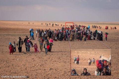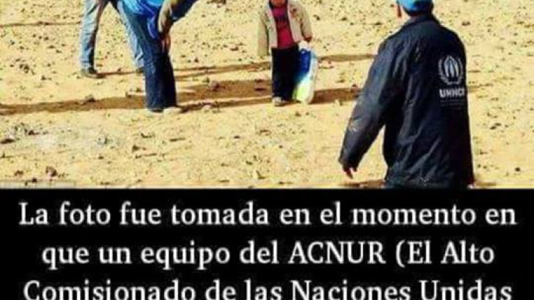 Podemos ver estos días en las redes sociales una foto en la que unos supuestos miembros del Acnur se dirigen a un niño que aparentemente cruza solo el desierto. El texto que acompaña a la imagen afirma que el pequeño tiene cuatro años, que es sirio y que huye de su país por el desierto en dirección a Jordania, llevando consigo "una bolsa con la ropa de su mamá y su hermana, quienes fueron asesinadas en Siria".