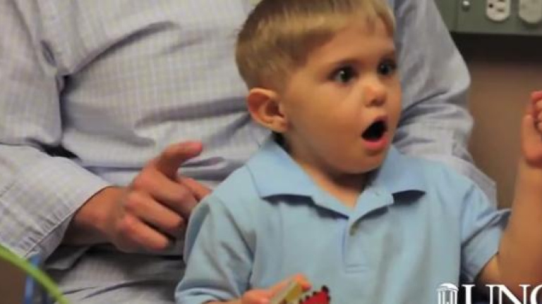 Grayson nació sin los nervios que conectan sus oídos al cerebro. Una técnica quirúrgica conocida como "implante auditorio en el tronco del encéfalo" le ha permitido escuchar por primera vez.