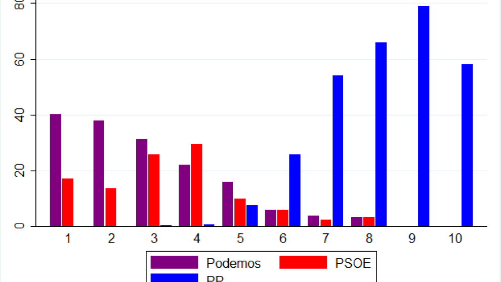 La mayoría de los votantes están en las casillas 3-4-5 ("centro izquierda"), justo donde Podemos y el PSOE están casi empatados.