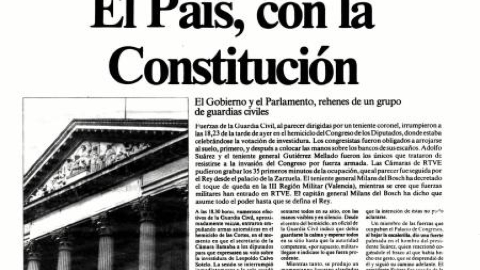 No crea la gente que me estoy yendo por los cerros. Es solo un ejemplo de que aquella Constitución que hoy El País aclama en su película y en su devenir diario ya no es lo que era. Como El País tampoco es lo que era. Solo hay que repasar el artículo 32 de nuestra Carta Magma (no es errata): "El hombre y la mujer tienen derecho a contraer matrimonio con plena igualdad jurídica". Y solo hay que interpretar, de maneras muy diferentes, el titular y título El País con la Constitución de aquel 24-F y de este febrero del año del señor de 2016. Nuestro mundo ha cambiado, pero El País y la Constitución no. La Constitución es un texto viejo que hay que conservar con mimo en los anaqueles del pasado. El País es hoy solo un texto viejo que se reescribe cada día (con honrosas excepciones).