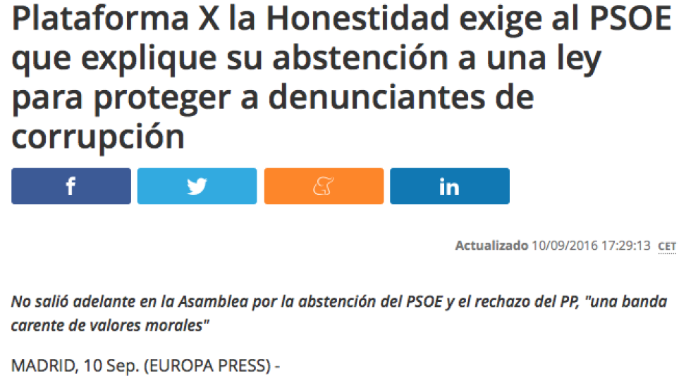 Es decepcionante pensar que sois el ardid que sostiene el Régimen: Desde la justicia militar hasta la corrupción pasando por el sistema electoral, las diputaciones, las privatizaciones, las puertas giratorias, el capitalismo salvaje... Todo lo habéis sostenido durante cuarenta años entre el PP y tu partido, el PSOE, y debido a ello sois los únicos que os oponéis a la incorporación de una ley de Protección al Denunciante que Unidos Podemos, Ciudadanos, Compromís, En Marea, En Comú, Esquerra Republicana, Bildu o Democracia i Llibertat apoyan. Es decir, PP y PSOE, codo con codo, contra todos los partidos políticos en la protección de la corrupción y el desamparo de los denunciantes.