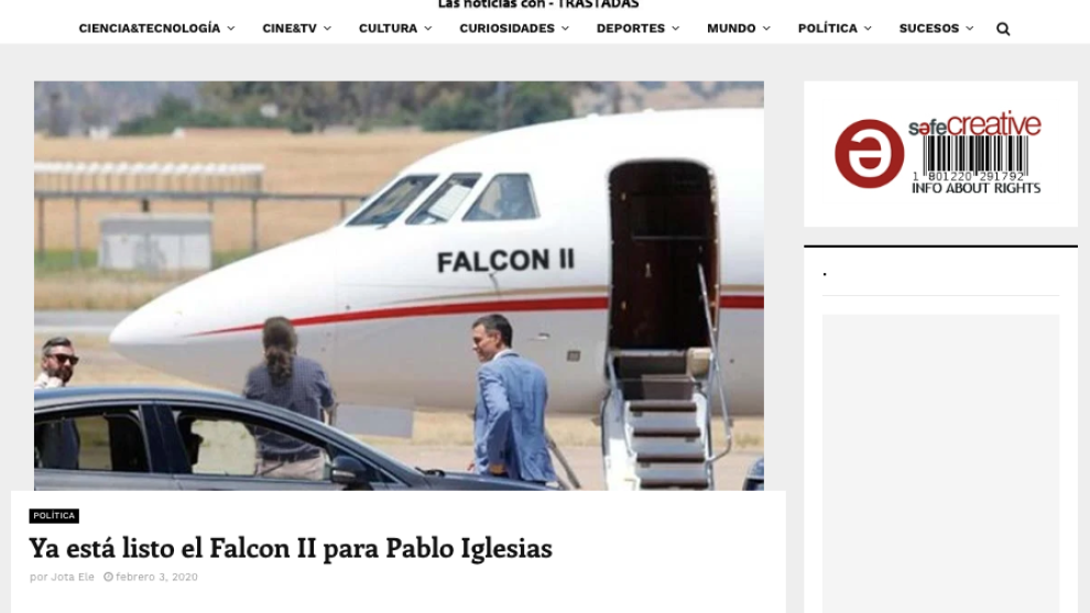 Ahora se comparte en redes sociales una información satírica que dice que "ya está listo el Falcon II para Pablo Iglesias", que podrá utilizar a demanda: "Pedro Sánchez ha hecho entrega esta mañana a Pablo Iglesias del Falcon II, para que el vicepresidente pueda desplazarse convenientemente y no depender del presidente. El líder de Unidas Podemos estaba visiblemente emocionado".