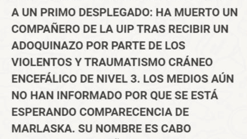 Circula por WhatsApp y Facebook desde hace unos días un supuesto "mensaje desde la Comisaría General de la Policía Nacional de Barcelona", donde el que lo recibe tiene "a un primo desplegado", que dice que "ha muerto un compañero de la UIP tras recibir un adoquinazo por parte de los violentos y traumatismo cráneo encefálico de nivel 3" (...) "Su nombre es cabo Baltanas" -o "Baltanás"- (...) "Deja viuda y dos hijos de 15 y 5 años".