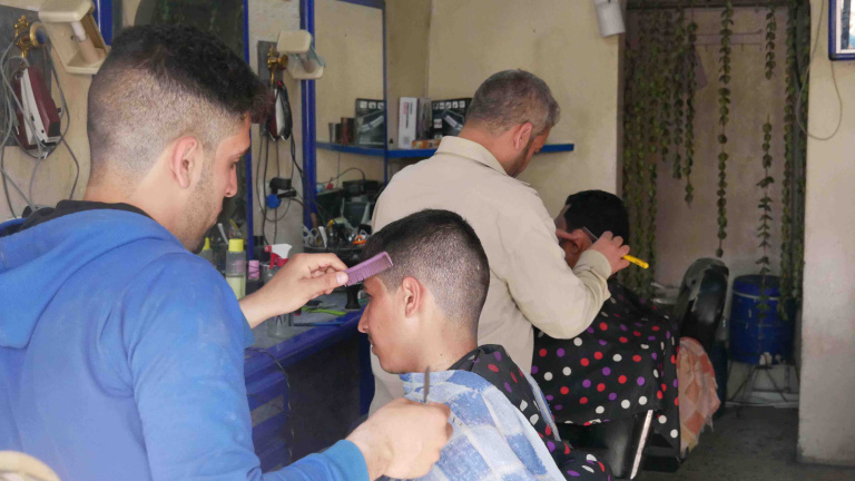 Las calles están destrozadas y se escuchan las explosiones de los morteros que caen a apenas 100 metros. Muy poca gente ha vuelto a sus casas, pero parece que todos han decidido concentrarse hoy en la barbería.
