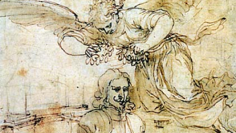 La ilustración se atribuye a Alonso Cano y se supone que la realizó cuando murió Quevedo para la publicación de su poesía.