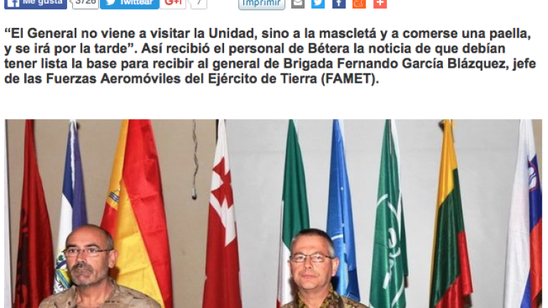 Hace poco hemos sabido que un general decidió usar un helicóptero para acudir a las Fallas y poder degustar una paella. No fueron pocos los que afirmaron sin rubor que lo que contaba en las novelas era falso o que, en todo caso, hacía mucho tiempo que episodios como los narrados no se producían, pero desde la publicación de las mismas las noticias no pararan de corroborarlas. Este acto, el uso de medios militares para fines particulares, es un delito o una falta muy grave en el caso del general y los mandos que le acompañaron, y un delito en el caso de todos aquellos que hayan realizado y firmado documentación falsa que afecte al servicio, como es el caso (parece ser que decidieron simular una visita a la Unidad Militar de Emergencias).