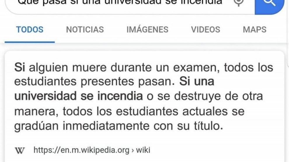 "Qué pasa si una universidad se incendia", lleva por título el breve texto de esta única presunta captura de Google que se comparte en redes sociales ahora y hace un par de meses. Es siempre la misma, es falsa y habita en una página de memes en la que se supone que todos los contenidos son inventados.