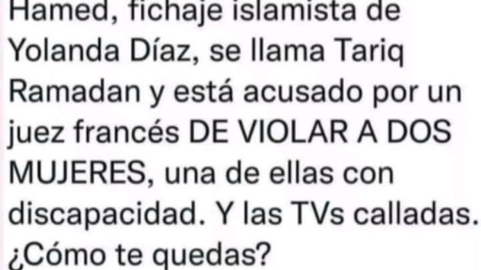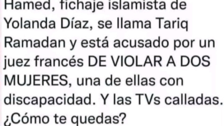 "Resulta que la pareja de Fátima Hamed, fichaje islamista de Yolanda Díaz, se llama Tariq Ramadan y está acusado por un juez francés DE VIOLAR A DOS MUJERES, una de ellas con discapacidad. Y las TVs calladas. ¿Cómo te quedas?".