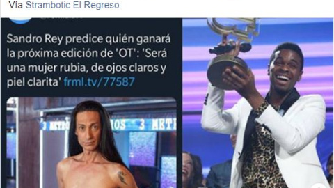 Su cagada más actual se confirmó hace unos días, cuando se conoció el ganador de la edición de 2018 del programa de televisión Operación Triunfo, y no era "una mujer rubia de ojos claros y piel clarita", como predijo Rey el pasado mes de marzo. El ganador de OT solo tiene 19 años pero es un pedazo de hombre de ojos oscuros llamado Famous, afincado en Sevilla aunque nacido en Amsterdam fruto de una pareja nigeriana, y más negro que el futuro de Sandro Rey como siga haciendo predicciones de este tipo.