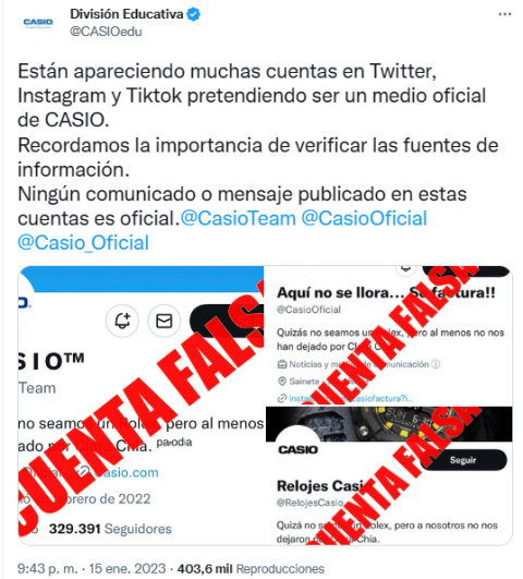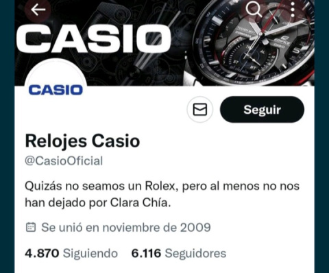 Tampoco ha anunciado el mítico fabricante de relojes en su Twitter que sus productos cuentan con "Correas diseñadas exclusivamente para que no te pique la muñeca" o que un Casio "Dura más que la relación de Piqué y Shakira".