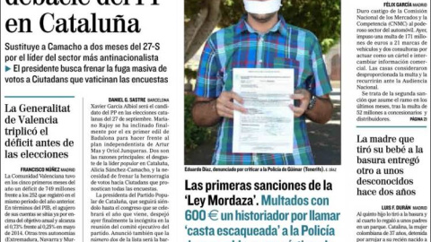 Estos mismos días, El País también nos dejaba claro por dónde va su campaña. Contigo pero sin ti. El martes y el miércoles titulaba con azotes: Rajoy disuelve las Cortes sin revelar su plan para Cataluña y La declaración de independencia no recibe respuesta de Rajoy. Ayer se domesticaba un poco: Rajoy reacciona y trata de unir a los partidos contra la secesión. Es curioso que un señor sea titular tres veces consecutivas tanto por su inacción como por su (única y relativa). Refleja muy bien cómo ha moldeado el tancredismo de Rajoy la percepción de la realidad que tenemos los cronistas: si se quita una legaña, titulamos que acaba de solucionar lo de la piedra de Sísifo.