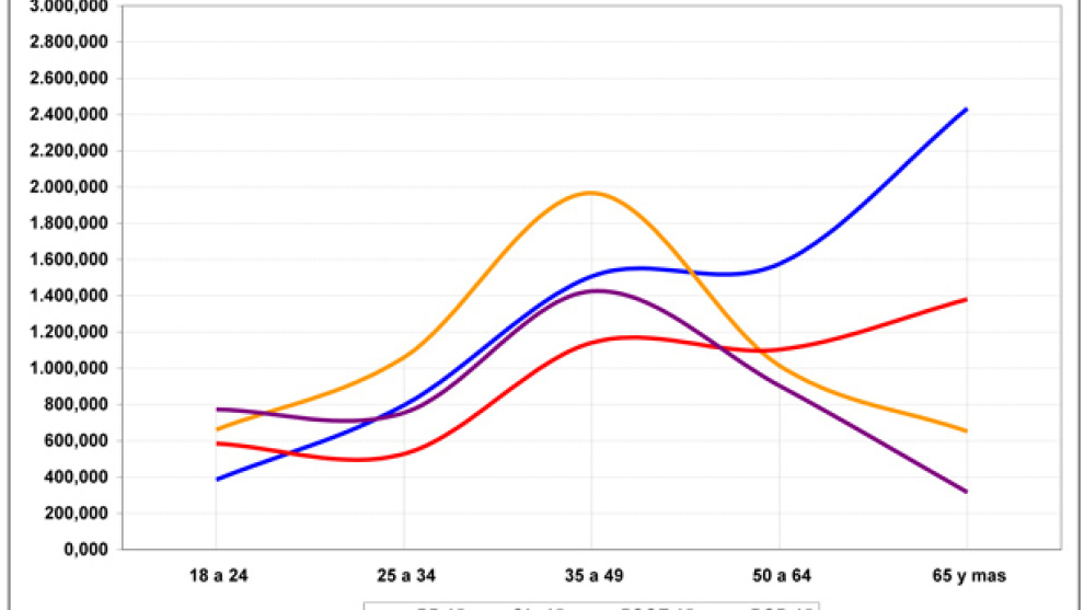 Sigamos con los jubilados. La preeminencia del Partido Popular en las preferencias electorales de los pensionistas es abrumadora: 2,4 millones de sus votantes tienen más de 65 años. Eso supone el 36,3% de todos los votos del PP… y prácticamente el mismo porcentaje (35,5%) del total de electores de la tercera edad. Más aún, como 1,4 millones de mayores de 65 se abstendrán, resulta que casi la mitad de todos los retirados que se acerquen a las urnas escogerán la papeleta de los "populares".