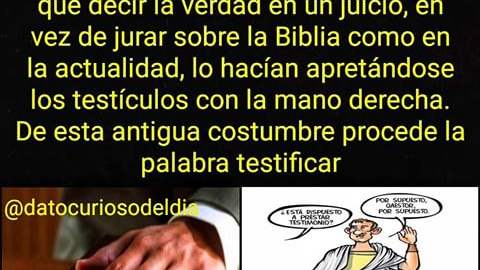 Lo de los romanos con testificar y los testículos, igual. La teoría que dice que el verbo testificar es cosa de los romanos, porque juraban que iban a decir la verdad con la mano derecha en los testículos y se los estrujaban si mentían, es bastante popular pero ni está probada ni es es el origen de la palabra testificar, que se parece pero no es igual y viene a significar "hacer de testigo". Testificar procede de testiguar y del latín testificare, no de testículo o de testículum.