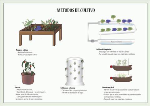 Cultivo hidropónico: es uno de los métodos más versátiles ya que no necesita tierra, se adapta a cualquier espacio y su construcción es fácil, ya que solo se necesita una tubería perforada y una bomba pequeña como la utilizada en los acuarios.
