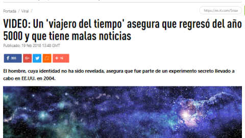 De este tipo de noticias de viajeros del tiempo de RT, me quedo con esta otra, que publicó el pasado 6 de octubre: "Arrestan a un 'viajero del tiempo' que vino de 2048 para advertir de una invasión extraterrestre".