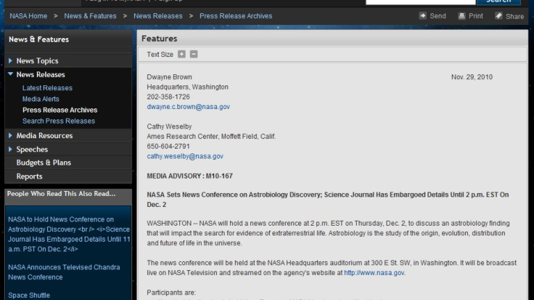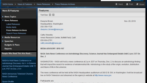Convocatoria de prensa de la NASA sobre un descubrimiento en astrobiología.